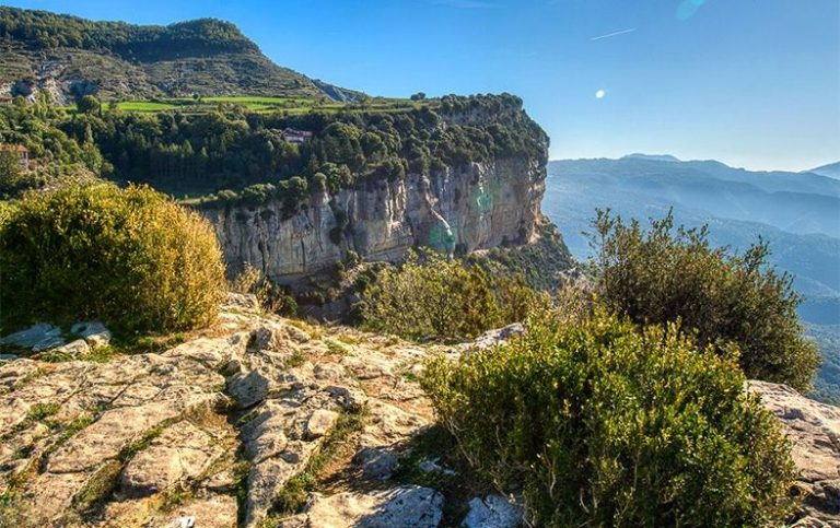 El pueblo se asienta sobre un imponente peñasco que se asoma a un gran precipicio, una imagen tan impactante como poco recomendable para quienes sufren de vértigo. A cambio, este enclave privilegiado regala unas vistas extraordinarias sobre los pantanos de Susqueda y Sau, con el perfil del macizo del Montseny dibujándose en el horizonte.